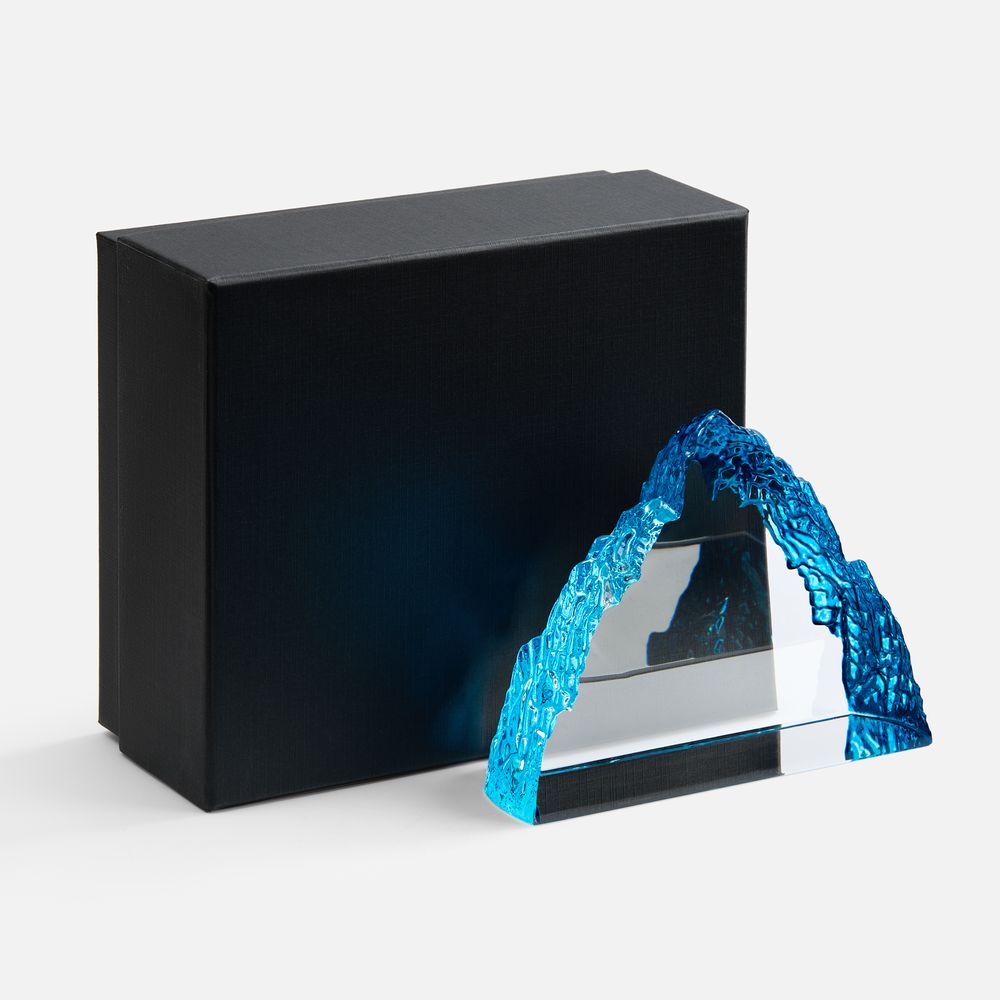 Необычная форма стелы, похожая на живописный горный хребет, символична и будет напоминать о покоренных высотах, вдохновляя на новые свершения. Эффект заснеженной вершины дополнительно усиливается благодаря голубоватому цвету.