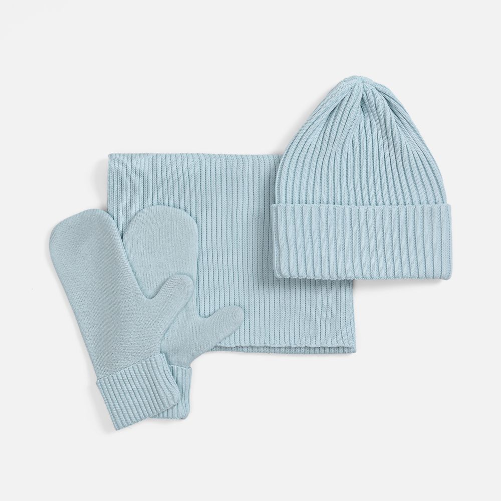 В набор входят удобный шарф с технологичным отверстием для быстрого завязывания, шапка с двойным отворотом и теплые двухслойные варежки с широкой манжетой. Все изделия связаны из акриловой пряжи, отличаются практичностью и элегантной простотой.