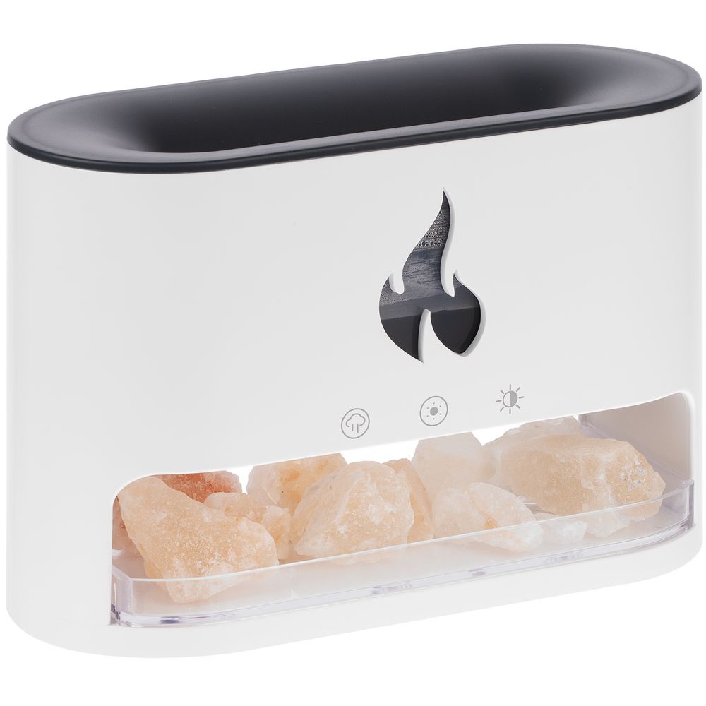 Благодаря оптическому эффекту пламя как будто вырывается из устройства, напоминающего настольный камин, а соль становится похожа на угли от прогоревших дров.