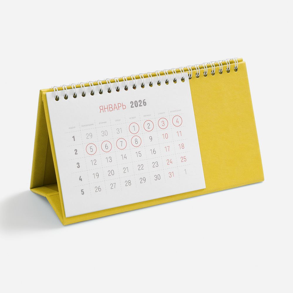 Настольный, перекидной календарь-домик выполнен из материала Latte, желтый KK.