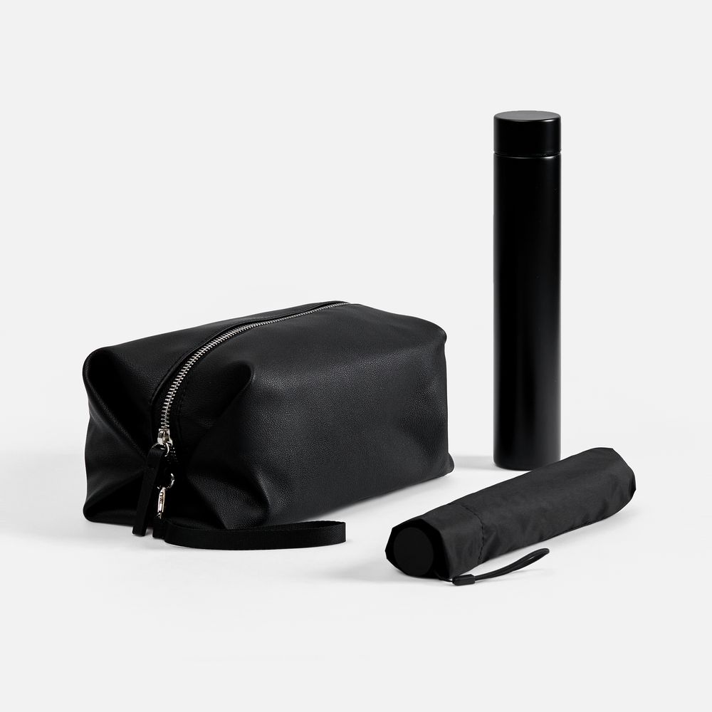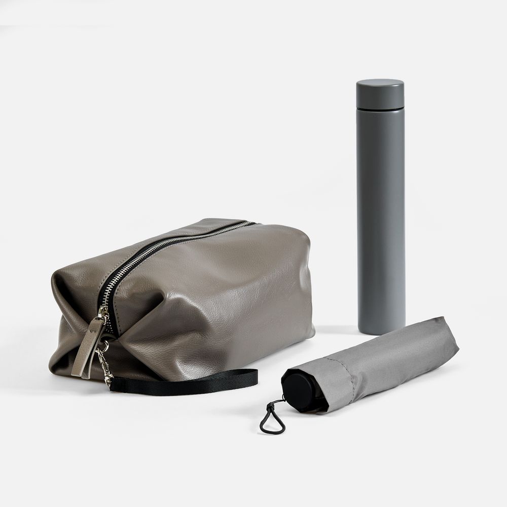 - несессер: 22х12х12 см, в сложении 23х14х4 см; зонт: длина 49 см, диаметр купола 90 см, длина в сложении 22 см; термобутылка: диаметр 4,3 см, высота 23,5 см