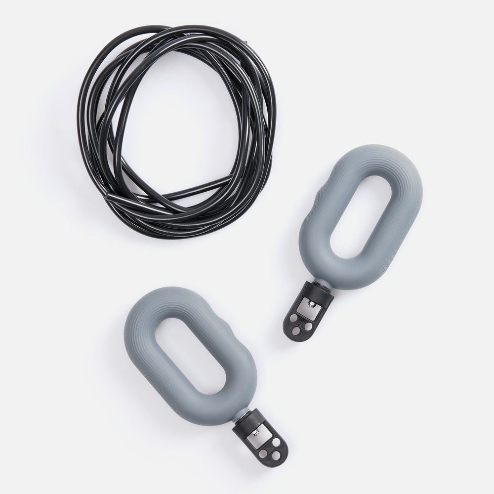 Шнур к ручкам-эспандерам крепится через пластиковый переходник с отверстиями для продевания шнура. Эспандеры выполнены из тактильно приятного силикона, обладающего высокой степенью эластичности и прочности, а широкий шнур (5 мм) — из плотного ПВХ.